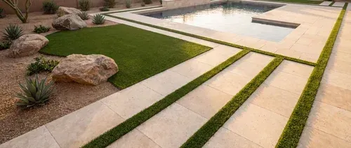 Some of the most interesting projects we've worked on use turf in smaller, intentional ways: a strip of green between travertine pavers, a tucked-in lawn area framed by natural stone and desert planting, a turf accent bordering a pool deck that adds color and texture without taking over the whole yard. These applications work particularly well in desert-modern designs where contrast between materials is part of the visual language.