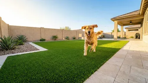 Dogs are hard on natural grass in Arizona. Recovery time is slow, irrigation fights constant evaporation, and high-traffic areas go bare by midsummer. Pet-specific turf products are available with improved drainage and antimicrobial infill that makes cleanup simpler and the surface more resilient to daily use. If you have dogs spending real time outside, it's worth walking through product options during the initial conversation.