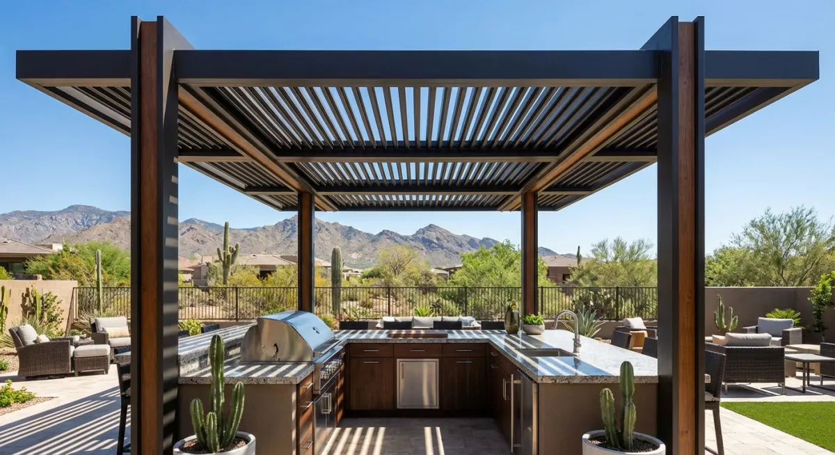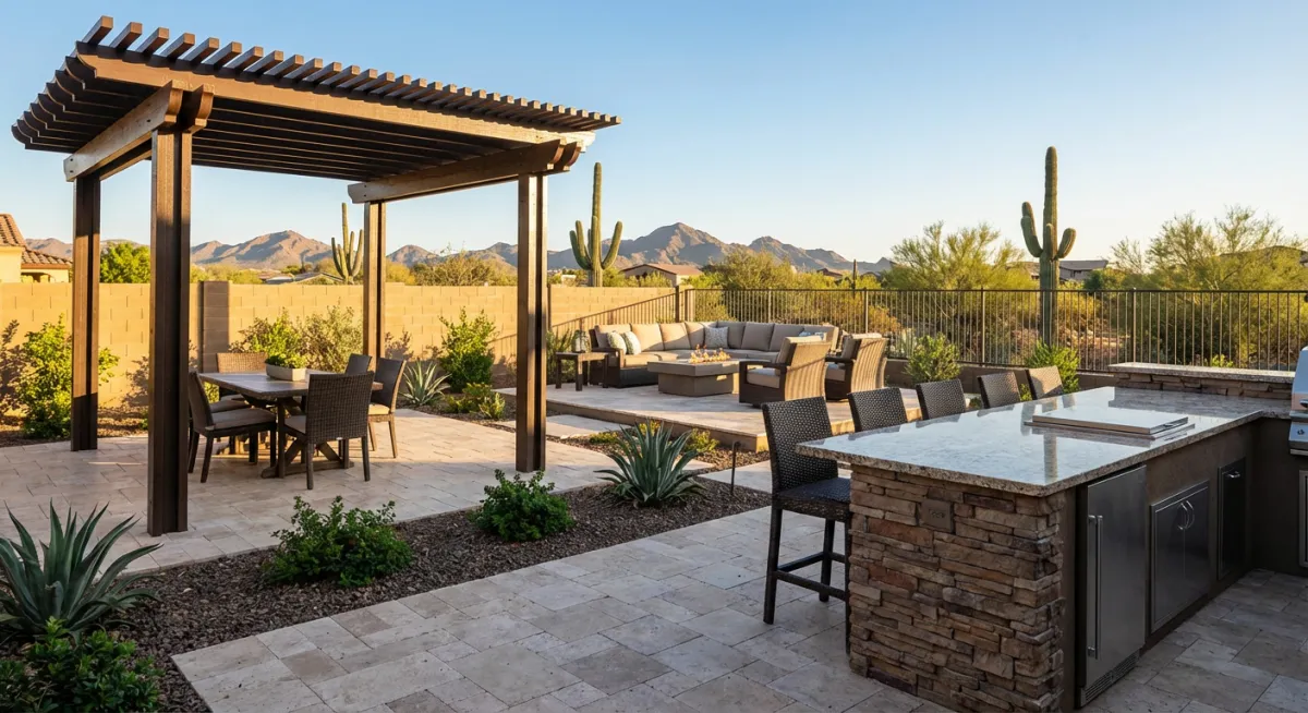 Outdoor kitchens, fire features, and pergolas designed for Arizona heat and monsoon winds. These aren't decorative additions. They're functional spaces that determine whether you'll actually use your backyard or just look at it.