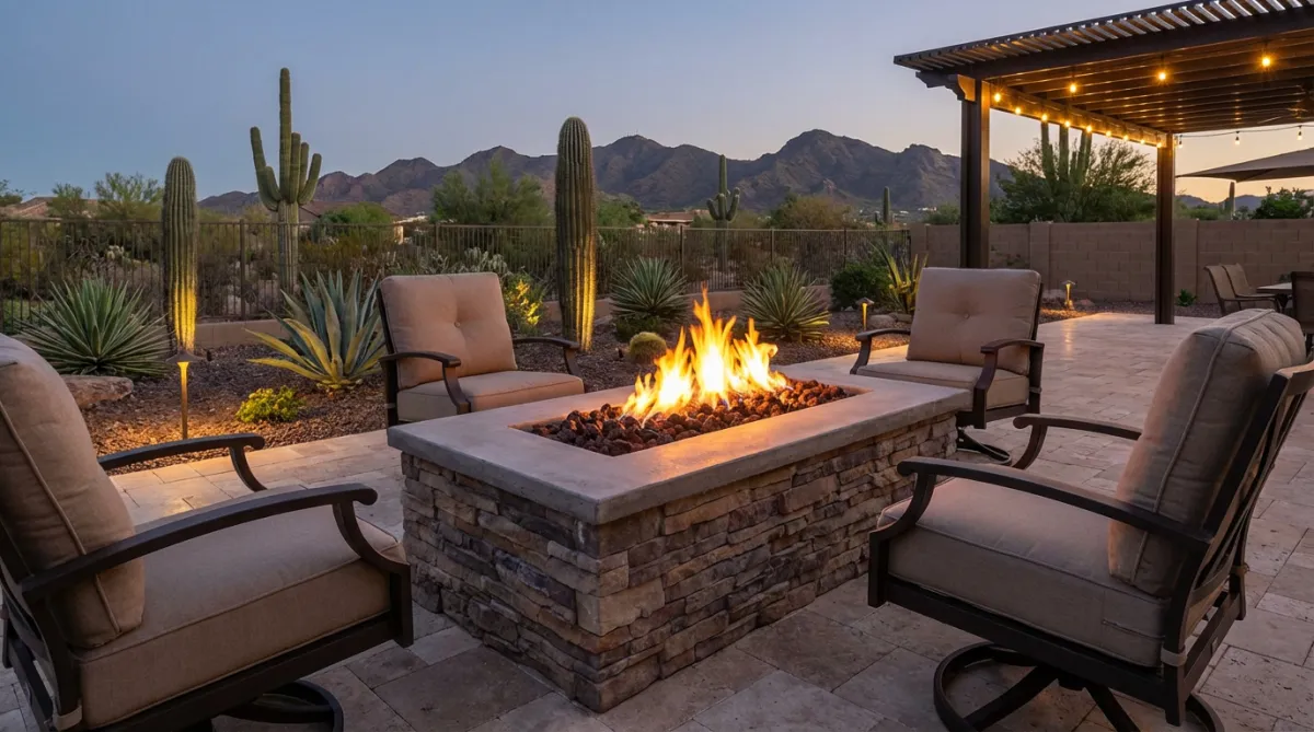A fire pit or fire bowl near the seating area is one of the better investments you can make for year-round outdoor living specifically. Arizona fall and winter evenings are genuinely pleasant; a fire feature makes them lingering occasions rather than quick outdoor check-ins.